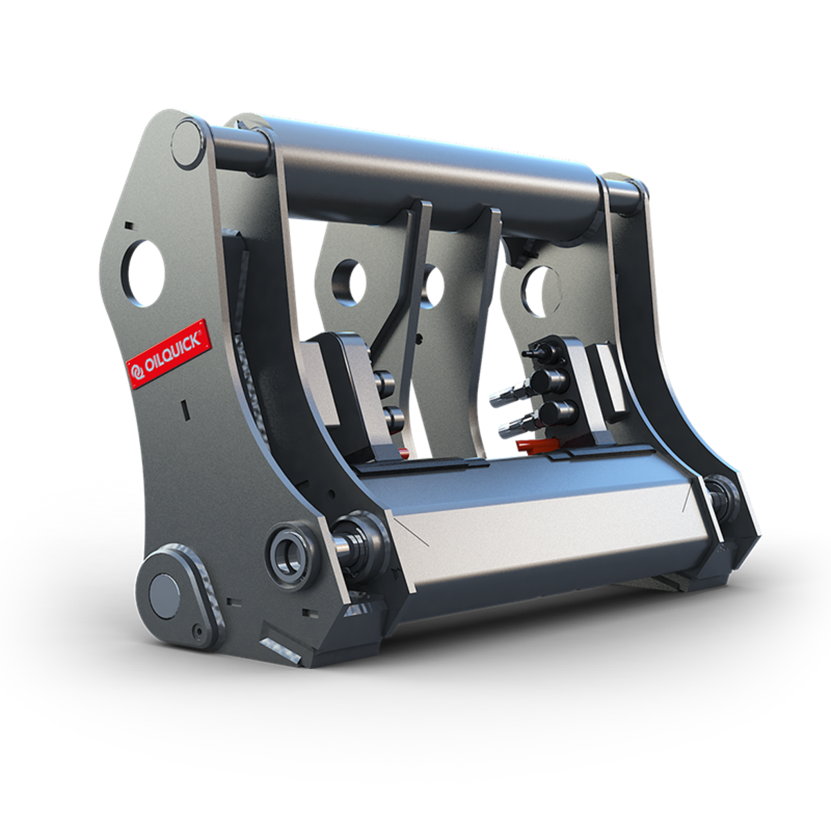 The OilQuick quick coupler locks the quick coupler to the attachment bracket, at the same time connecting the hydraulic hose couplings. All of this is done in one motion.