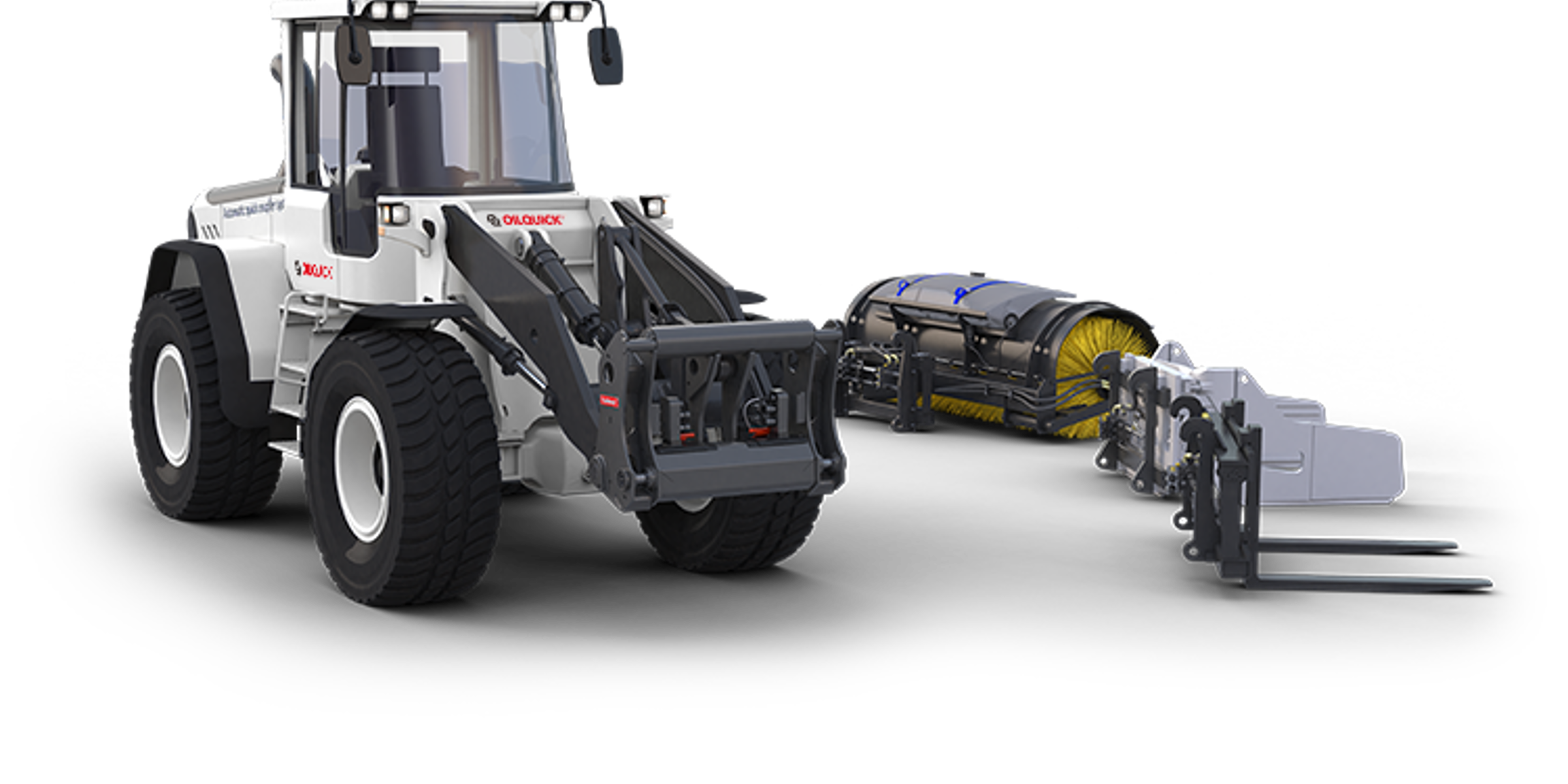 OilQuick is an automatic quick coupler system for wheel loaders, which allows hydraulic work tools to be connected and disconnected directly from the drivers cab. The operator can change between various work tools within a few seconds, such as log forks, high dumping buckets, pallet forks with hydraulic tine adjustment, sweepers, bale clamps, rotating bale clamps etc. You always therefore have the right attachment for the job.